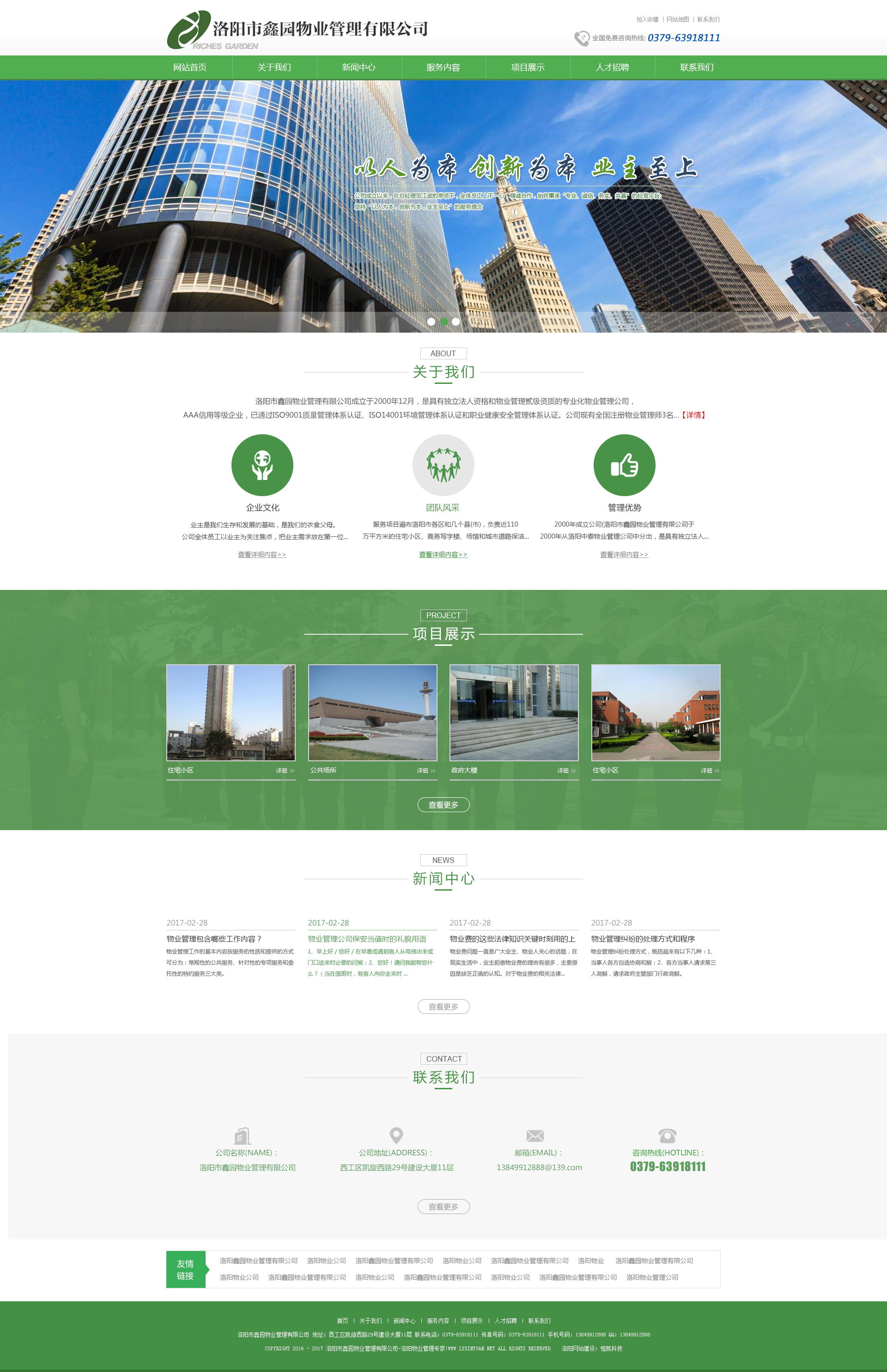 洛陽市鑫園物業(yè)管理有限公司成立于2000年12月,是具有獨(dú)立法人資格和物業(yè)管理貳級(jí)資質(zhì)的專業(yè)化物業(yè)管理公司,AAA信用等級(jí)企業(yè),已通過ISO9001質(zhì)量管理體系認(rèn)證、ISO14001環(huán)境管理體系認(rèn)證和職業(yè)健康安全管理體系認(rèn)證。