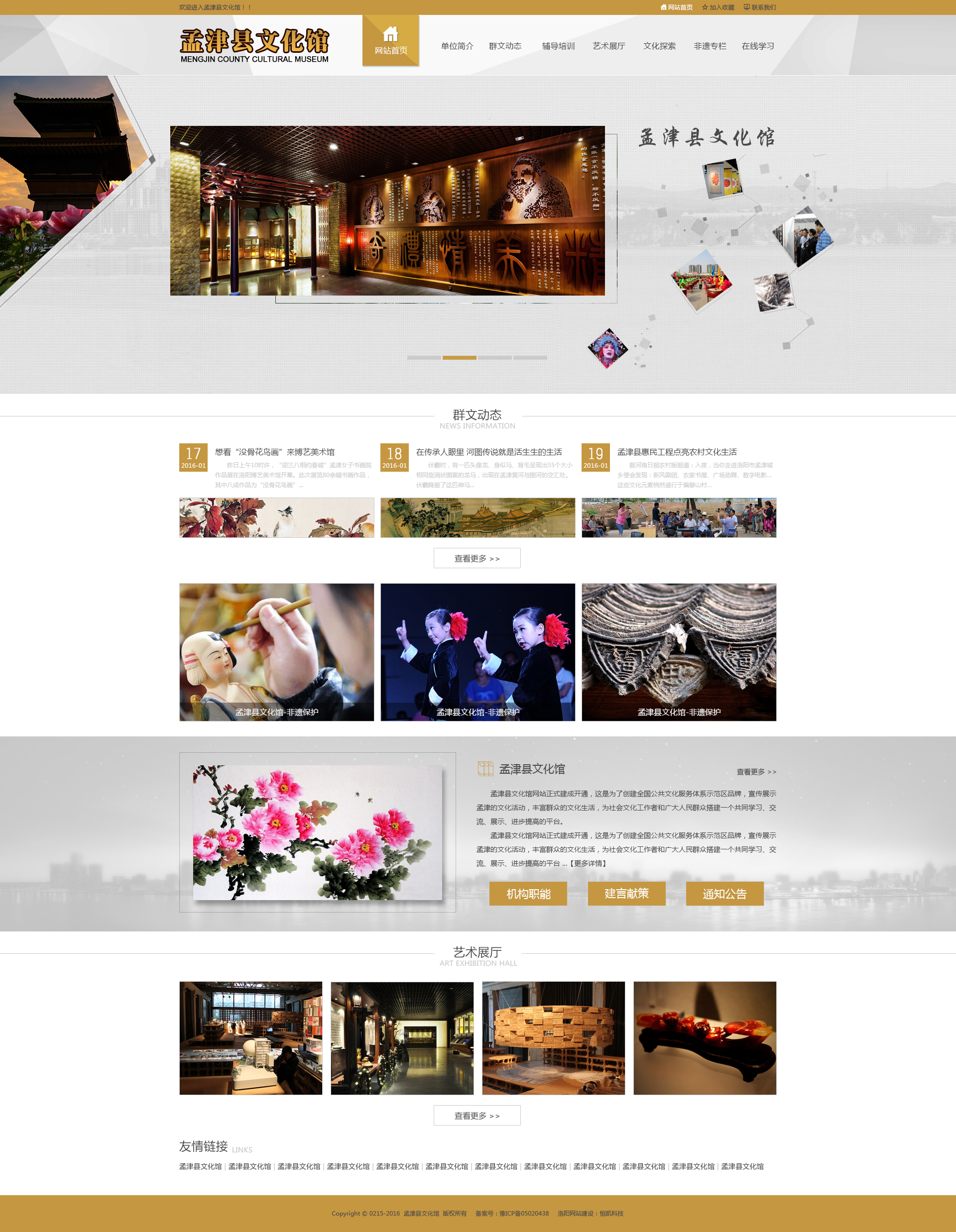 孟津縣人民文化館擁有獨立辦公樓一棟,館內設有辦公室、文學書畫創(chuàng)作室、輔導部、攝影部、電子閱覽室、展廳、非遺中心、非遺展廳、活動部、排練室、檔案室多功能會議室等。