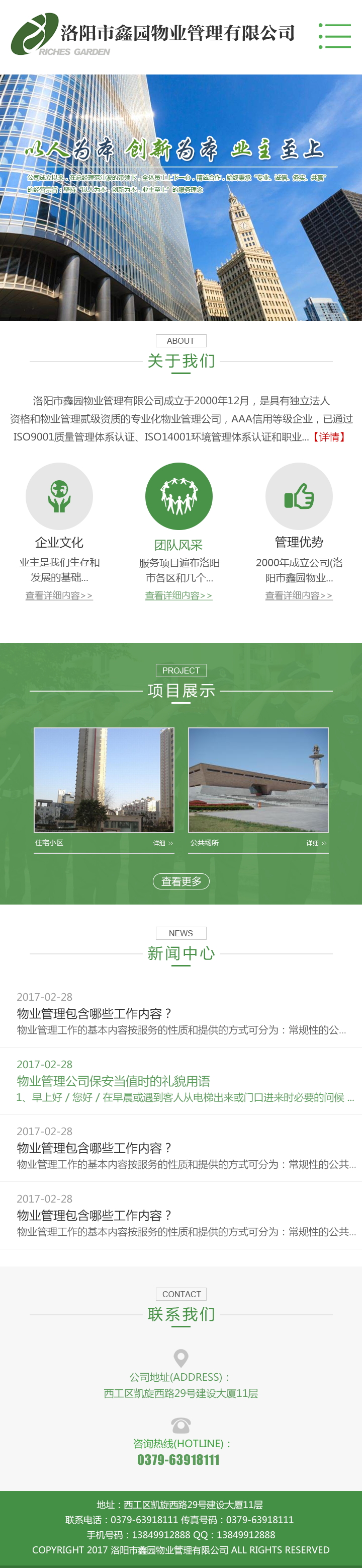 洛陽市鑫園物業(yè)管理有限公司成立于2000年12月,是具有獨(dú)立法人資格和物業(yè)管理貳級資質(zhì)的專業(yè)化物業(yè)管理公司,AAA信用等級企業(yè),已通過ISO9001質(zhì)量管理體系認(rèn)證、ISO14001環(huán)境管理體系認(rèn)證和職業(yè)健康安全管理體系認(rèn)證。